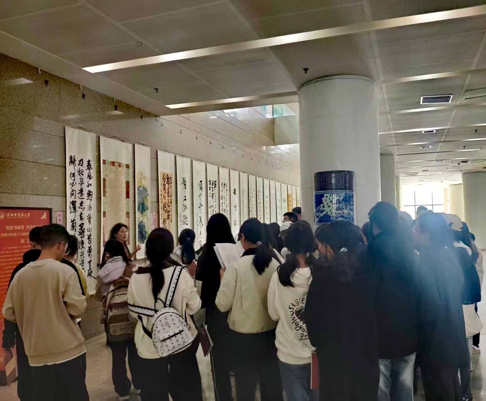 活动特别邀请学校书画院副院长、秘书长、尚真书院关工委副主任张峥丽老师现场为师生讲解。她围绕展出作品的风格特点、创作技法与时代背景,从笔墨运用的精妙、画面构图的巧思到作品蕴含的文化深意,为书院师生展开细致解读,既引导大家感受书法线条的刚劲力道与绘画笔墨的灵动韵味,更通过《黄帝内经》《伤寒论》等中医药主题作品,串联起传统书画艺术与岐黄文化的内在关联,让师生在赏析中打破“艺术”与“专业”的界限,深化对“美”的多元认知,理解传统文化背后兼具艺术质感与精神内核的美育价值。